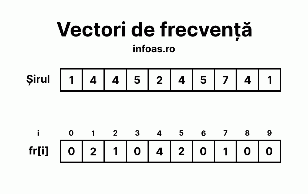 Vectorul de frecvență este un vector care reține numărul de apariții al fiecărei valori dintr-un șir. Mai exact, un astfel de vector de apariții ne ajută să determinăm pentru orice valoare, de câte ori apare în șirul nostru (chestie care ne poate ajuta în cazul unor probleme mai dificile).